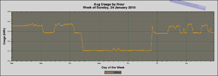 I'd like to point out something that ECOP showed us about the beta test site. The background for this case is that we're monitoring the circuit that feeds the office, which has a dual-monitor computer, a back-up power supply, and a small Ethernet switch, all of which are nearly always powered up, and a CFL ceiling light which is almost never on. Figure 1 is a reduced-size image of the actual graph, but you can still see the transitions clearly.