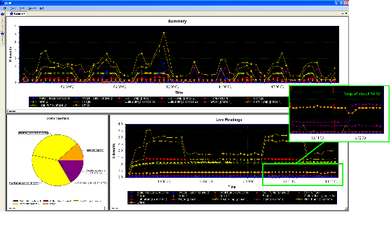 Notice that for Sunday the usage is flat, but for the first half of Monday there is a shallow dip for nearly 12 hours. Wondering why this happened on Monday but not on Sunday, we started to theorize. We thought that maybe, under some circumstances, the computer monitors in the office were not entering power-save mode. Some trial-and-error testing confirmed this to be the case. A further bit of testing also verified that when the monitors are off a matching drop in the load can be seen in real-time using ECOP (Figure 2). We are now absolutely certain this is related to the monitors and the screen shot below shows the measurements we used to prove it.